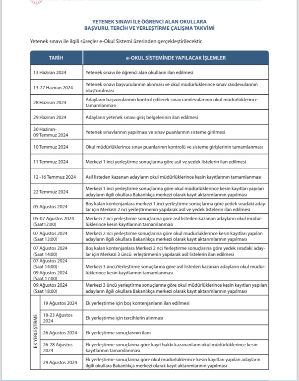 Merhaba sayın veliler ve öğrenciler özel yetenek sınavlarına ( resim, müzik, spor ) girecek öğrenciler için klavuz belli olmuştur. Kılavuzda resim, spor lisesi yetenek sınavında hangi konuların puanlanacağı ile ilgili detaylı bilgiler bulunmaktadır. Yetenek sınavları başvuruları e okul üzerinden ya da ilgili okula attığım kılavuzda bulunan ek1 formu doldurup giderek yapılmaktadır. 13-27 Haziran Tarihleri arasında başvurularınızı yapabilirsiniz.